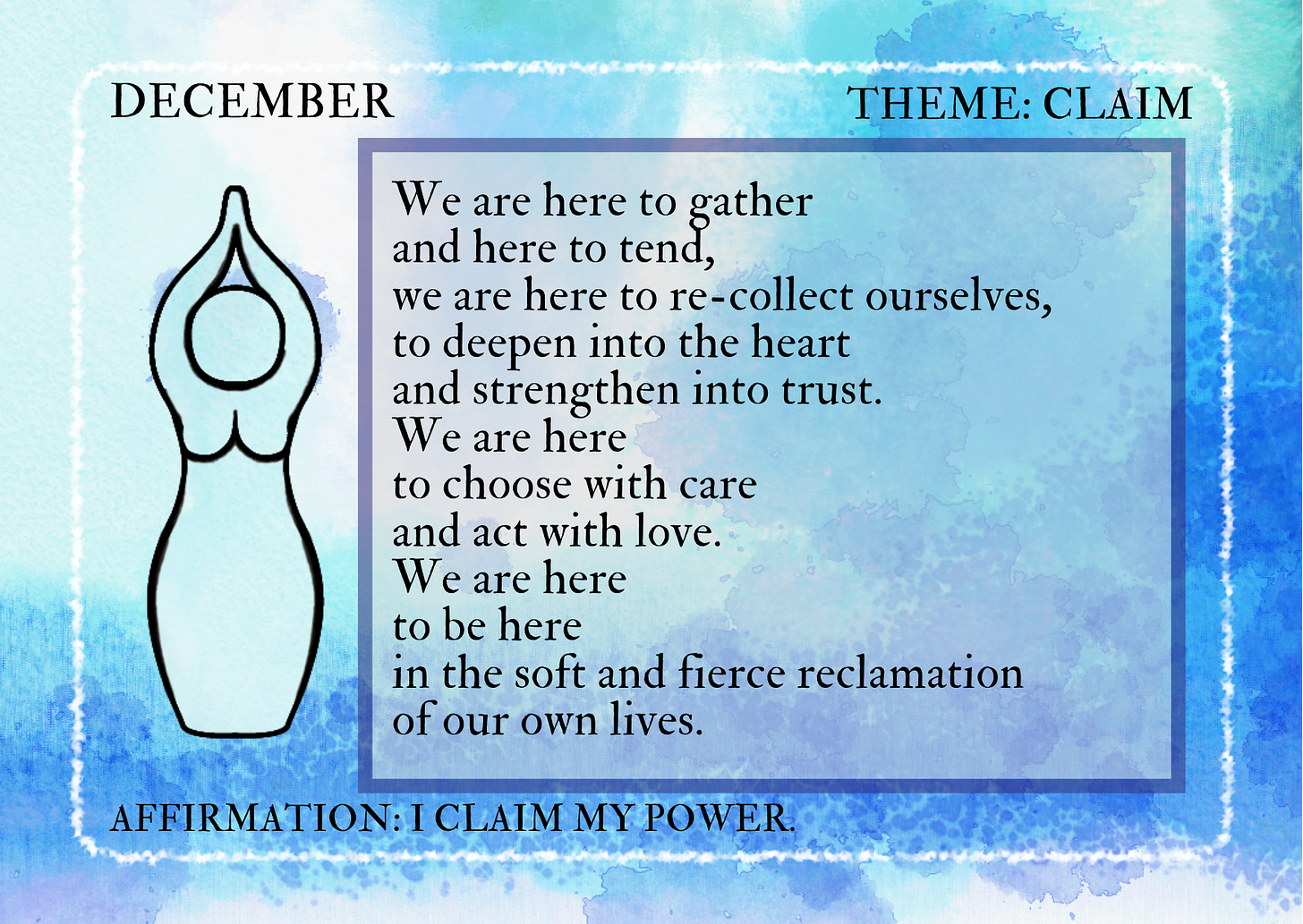 The theme for #30DaysofGoddess this month is Claim. Everything you need for December’s practice including a brand new 20 minute practice video, your sampler pack of printables, and monthly snapshot cards are included for you right in this newsletter. You are also welcome to check out the practice homepage: #30DaysofGoddess.