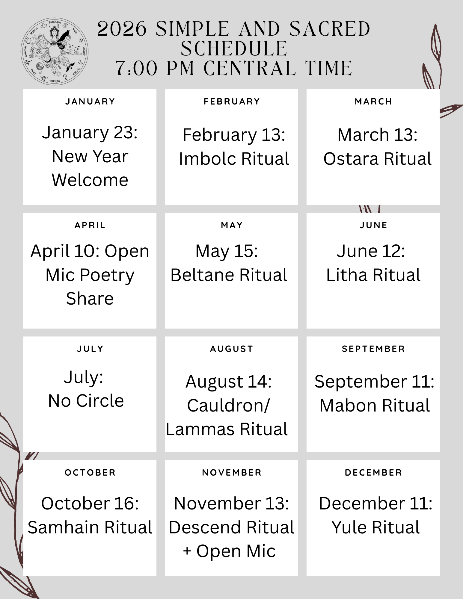 This virtual circle is usually offered live monthly on the second Friday of the month. In January, our schedule is slightly different and will take place on Zoom on January 23rd instead. January’s Circle will have a New Year and New Beginnings theme. A calendar of our events for the year is included below.